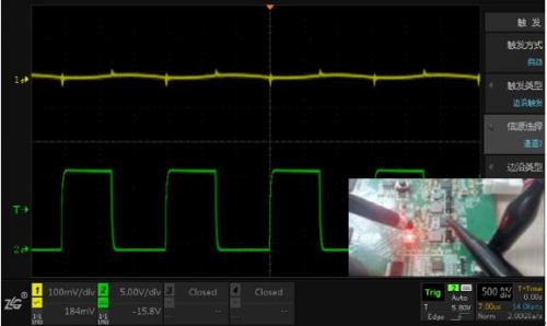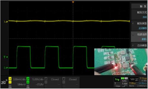測試方法:通道1測量小信號(100mv/div),通道2測量大信號(5V/div),觀察信號互相影響的情況。