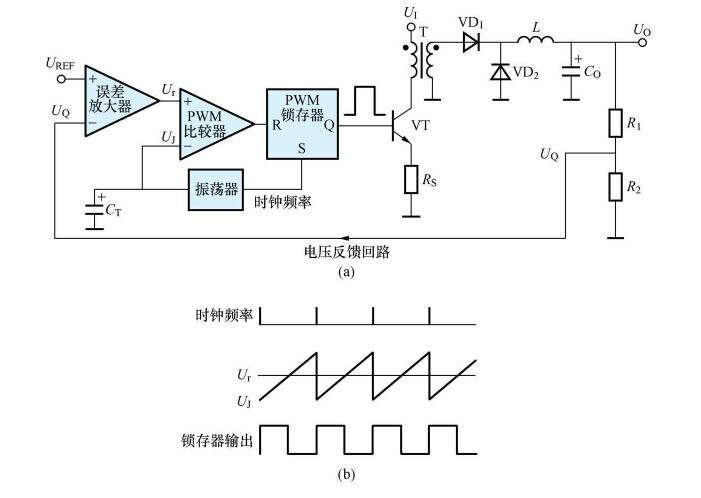 電壓控制是開關(guān)電源最常用的一種控制類型。以降壓式開關(guān)穩(wěn)壓器(即Buck變換器)為例,電壓控制型的基本原理及工作波形分別如圖1 (a)、(b)所示。其特點(diǎn)是首先通過對(duì)輸出電壓進(jìn)行取樣(必要時(shí)還可增加取樣電阻分壓器),所得到的取樣中壓UQ就作為控制環(huán)路的輸入信號(hào)。然后對(duì)取樣電壓和基準(zhǔn)電壓UREF進(jìn)行比較,并將比較結(jié)果放大成誤差電壓Ur,再將Ur送至PWM比較器與鋸齒波電壓Uj進(jìn)行比較,獲得脈沖寬度與誤差電壓成正比的調(diào)制信號(hào)。圖1 (a)中的振蕩器有兩路輸出,一路輸出為時(shí)鐘信號(hào)(方波或矩形波),另一路為鋸齒波信號(hào), CT為振蕩電容。T為高頻變壓器,VT為功率開關(guān)管。降壓式輸出電路由整流二極管VD1、續(xù)流二極管VD2、儲(chǔ)能電感L和濾波電容Co組成。PWM鎖存器的R為復(fù)位端,S為置位端。
