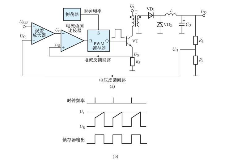 電流控制型是在電壓控制環(huán)的基礎(chǔ)上又增加了電流控制環(huán),其基本原理及工作波形分別如圖2 (a)、(b)所示。Us為電流檢測(cè)電阻的壓降,此時(shí)PWM比較器變?yōu)殡娏鳈z測(cè)比較器。電流控制型需通過檢測(cè)電阻來檢測(cè)電流,并且可逐個(gè)周期的限制電流,便于實(shí)現(xiàn)過電流保護(hù)。固定頻率的時(shí)鐘脈沖將RS鎖存器置位,從Q端輸出的驅(qū)動(dòng)信號(hào)為髙電平,使功率開關(guān)管VT導(dǎo)通,髙頻變壓器一次側(cè)的電流線性地增大。當(dāng)電流檢測(cè)電阻Rs上的壓降達(dá)到并超過Ur時(shí),電流檢測(cè)比較器翻轉(zhuǎn),輸出的高電平將鎖存器復(fù)位,從Q端輸出的驅(qū)動(dòng)信號(hào)變?yōu)榈碗娖剑顜躁P(guān)管關(guān)斷,直到下一個(gè)時(shí)鐘脈沖使RS鎖存器置位。